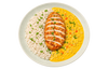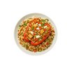 Rode paprika, gevuld met sappig kippengehakt, ricotta en een saus op basis van tomaat, wortel, knolselderij en prei. Afgewerkt met een lichte kaastopping, geserveerd met rijst.